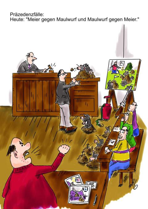 Andere versuchen es auf juristischem Wege und verklagen den Maulwurf unter Vorlage von erdrückendem Beweismaterial. Der Anwalt der Beklagten wird da einfach überhört im wüsten Geschrei der Anschuldigungen oder aufgrund seiner geringen Körpergröße und piepsenden Stimme, nicht wahrgenommen.