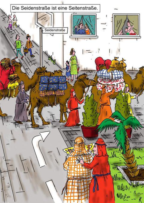 Hier hat sich einfach eine Karawane in der Stadt "verlaufen" auf der Suche nach der "Seidenstraße", die nichts weiter als eine banale "Seitenstraße" ist.