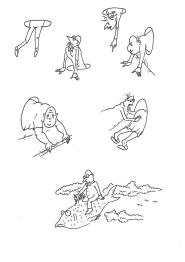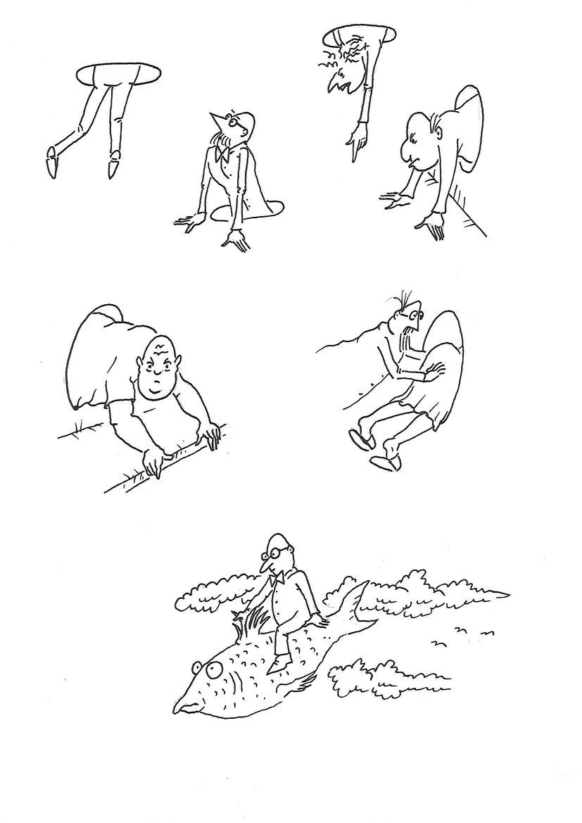 Eine mögliche Form der Strichelei. Die hier abgebildeten Zeichnungen sind Variationen zu einem Thema, das man mit "In das Loch und aus dem Loch" bezeichnen könnte. Die Zeichnung unten, mit dem Fisch, ist unabhängig von diesem Thema.