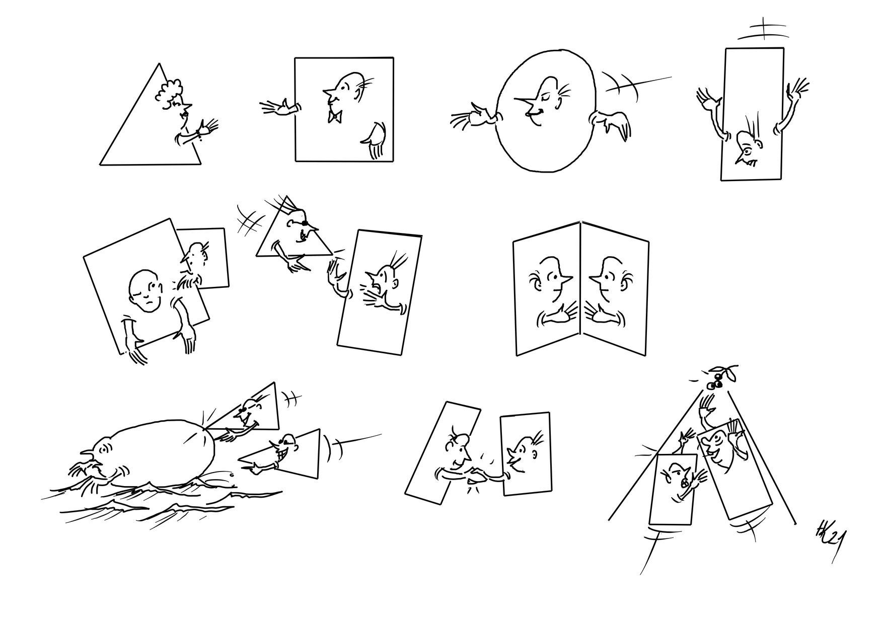 Hier sind einfach geometrische Grundformen, wie Dreieck, Rechteck, Ellipse mit Figuren kombiniert und diese eigenständigen Gebilde stehen untereinander nochmal in verschiedenen Wechselwirkungen.
